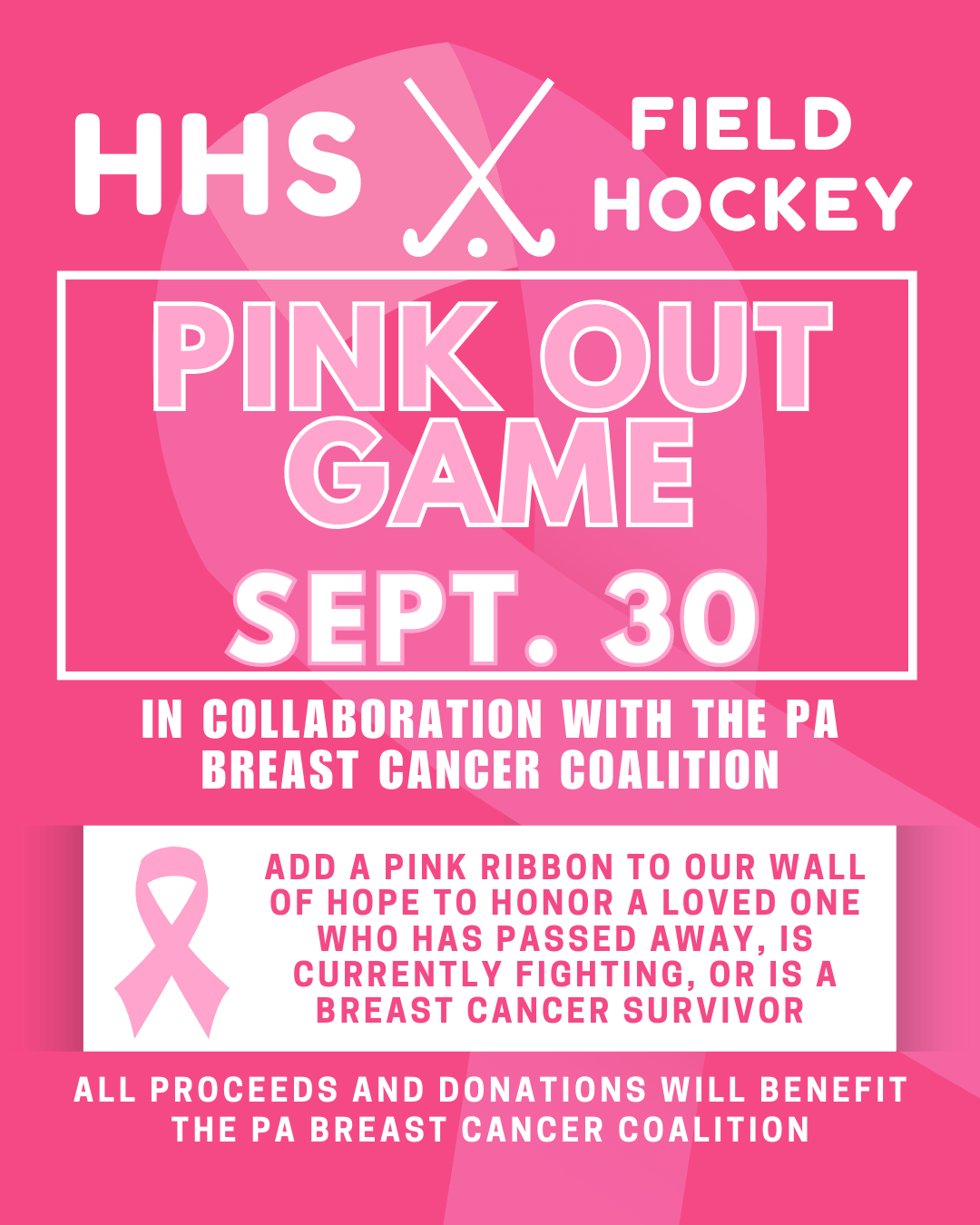 Join the Hershey High School Girl’s Field Hockey team for their annual Pink Out game, honoring breast cancer survivors and spreading awareness! Hershey faces Palmyra in a non-conference game on Tuesday, September 30 at 5:00pm for JV and 6:30pm for Varsity!