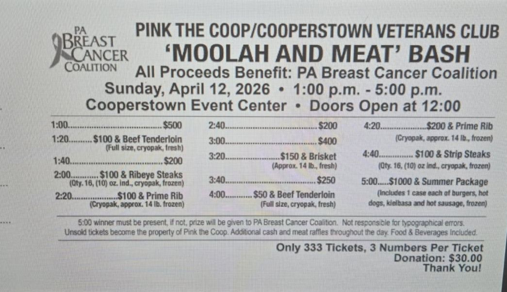 Cooperstown Vets & Sportsmen will start their 2026 Pink The Coop with a Moolah (Cash) & Meat Bash on Sunday, April 12, 2026. Tickets are $30 for 3 numbers. Drawing every 20 minutes for cash and meat prizes. Tickets available at the club.