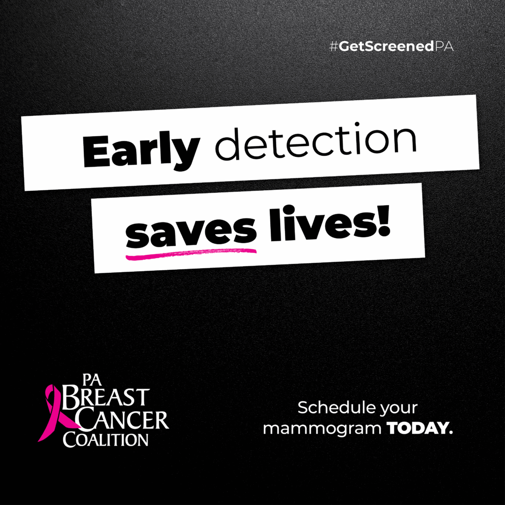 – Find a graphic from our toolkit that speaks to you and download it! Add your post and start making a difference. If your post reaches even 1 woman who schedules her mammogram, you made an impact. - Use hashtags #KnowYourRisk, #EarlyDetectionSavesLives or #GetScreenedPA