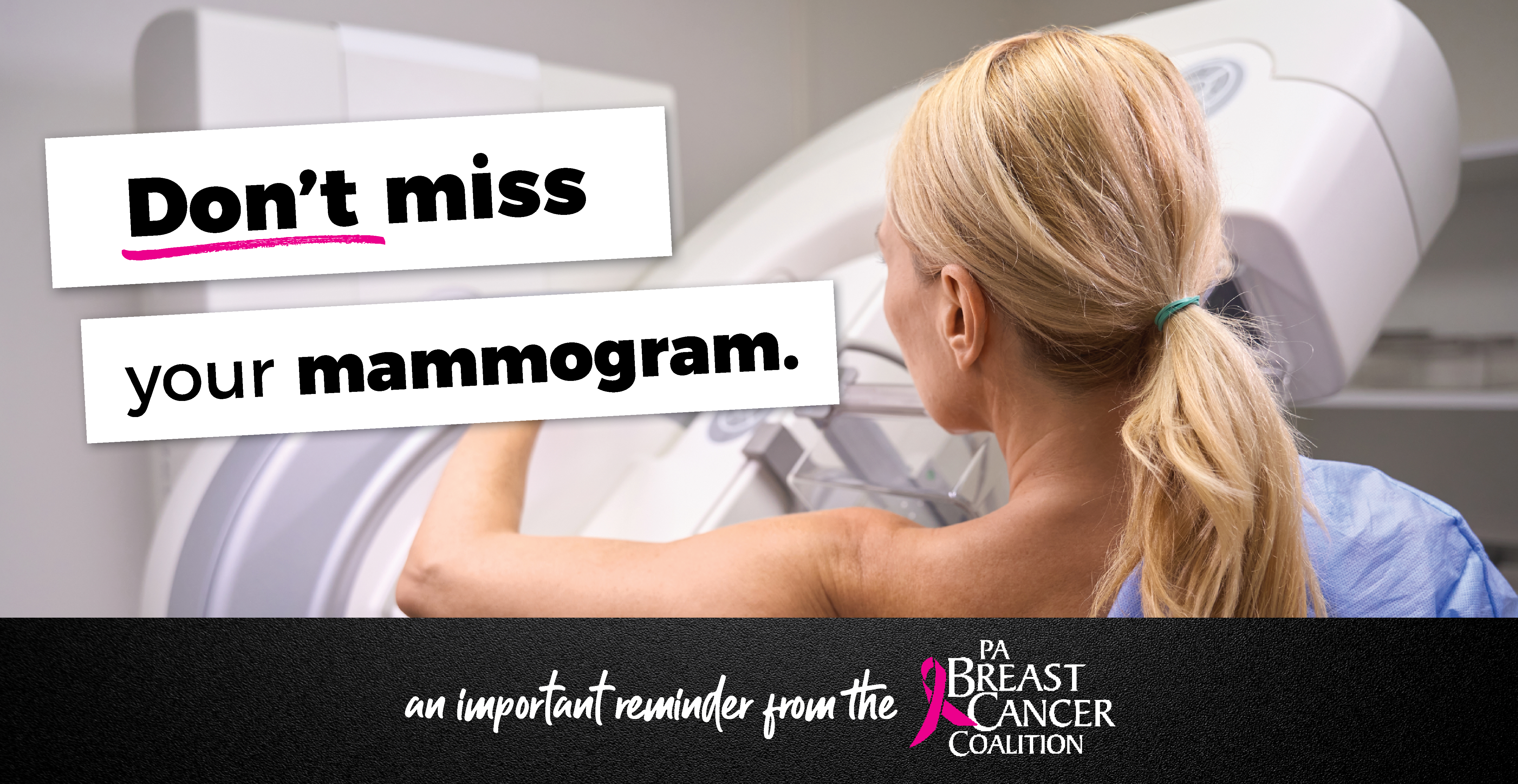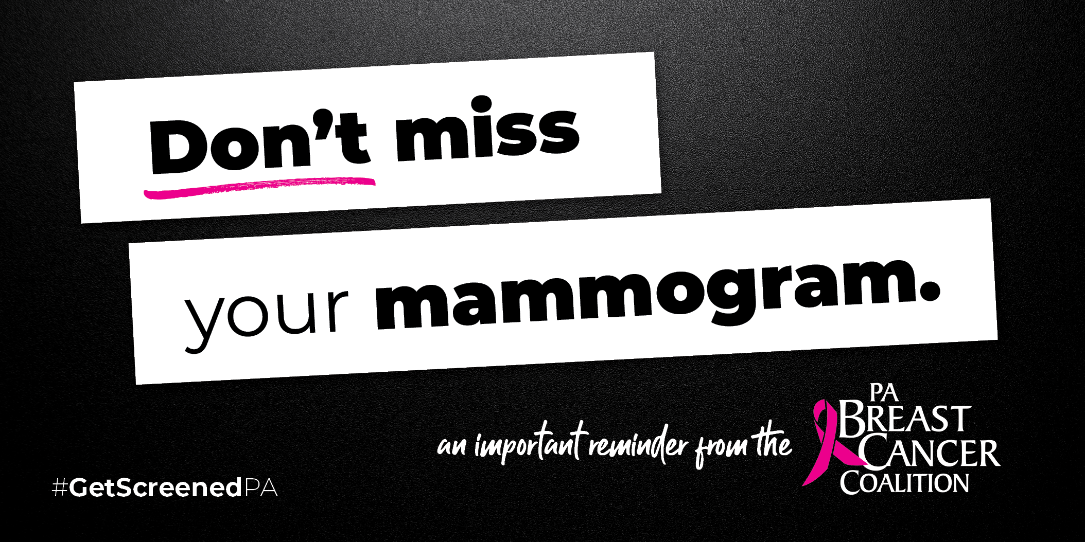 SAMPLE POST 3:It The 5-year survival rate for #breastcancer when detected at its earliest stage is 90%. Please take the time TODAY and schedule your mammogram. Early detection saves lives! Let’s #GetScreenedPA OR Did you know… Don’t put it off. Schedule your mammogram TODAY. Early detection saves lives. #GetScreenedPA | ![]() |