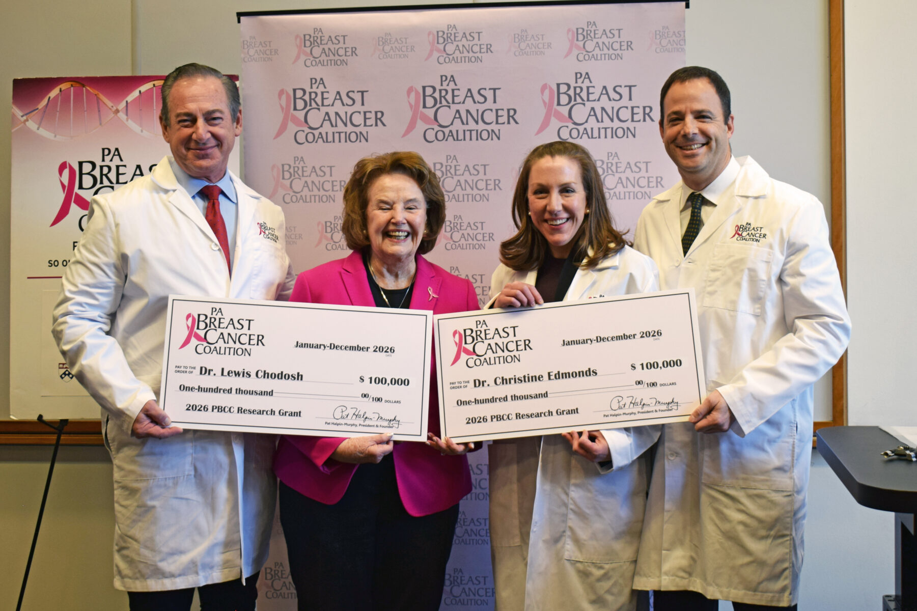 The PA Breast Cancer Coalition (PBCC) recently presented two $100,000 grants to breast cancer researchers at the University of Pennsylvania Perelman School of Medicine: Lewis Chodosh, M.D., Ph.D., and Christine Edmonds, M.D..